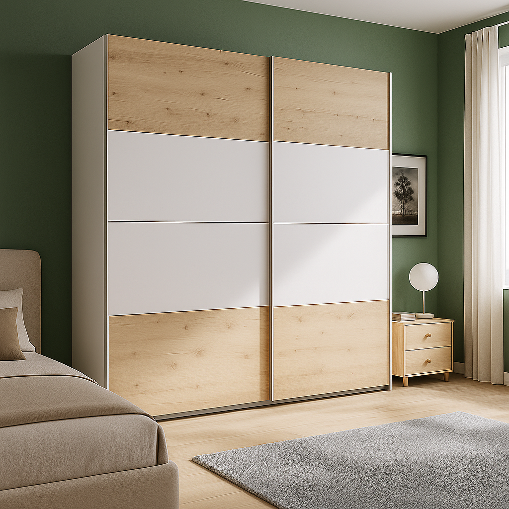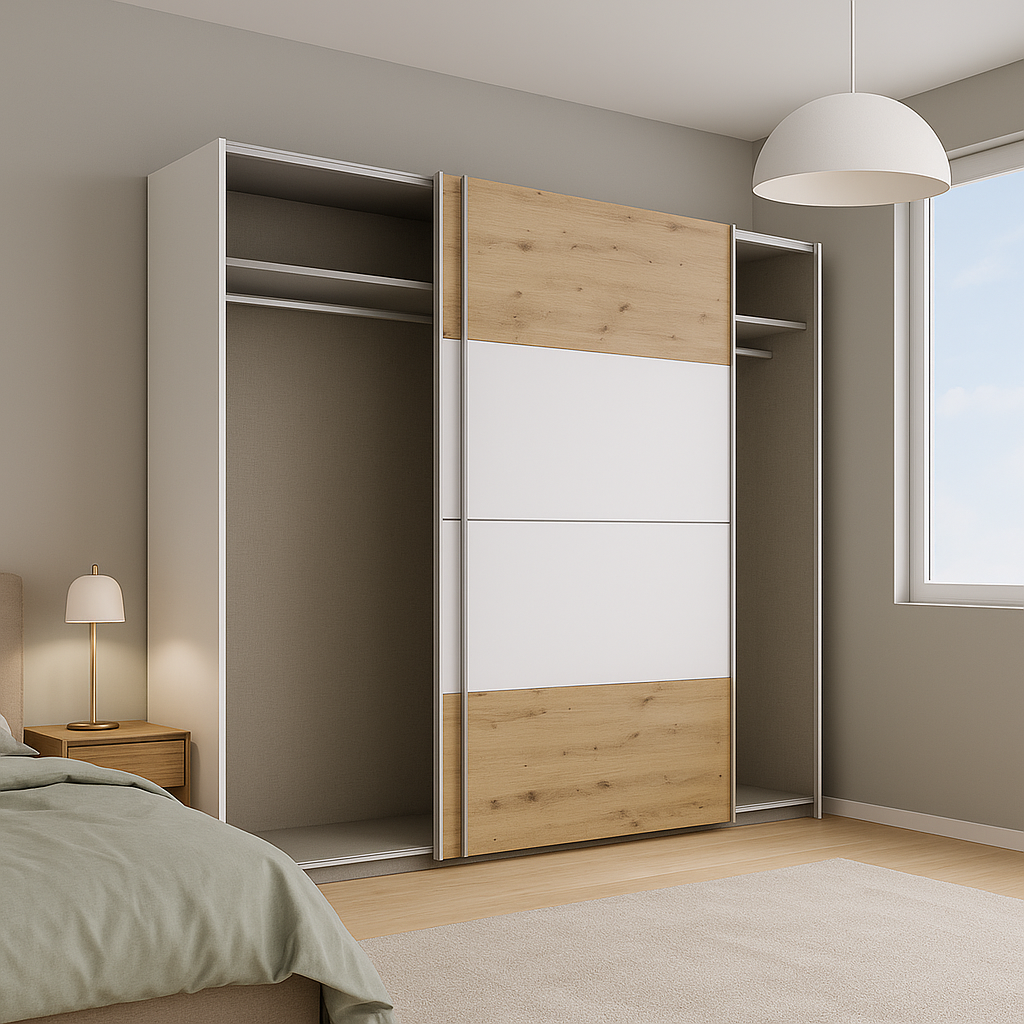 Mantén tu dormitorio siempre ordenado con este armario de puertas correderas de estilo moderno y líneas elegantes. Su diseño actual lo convierte en una pieza práctica y decorativa, perfecta para quienes buscan funcionalidad y estética en un mismo mueble.